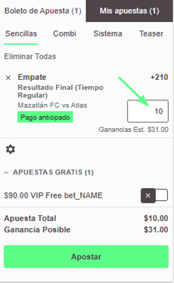 - Al final de tu boleto de apuesta encontrarás la opción de apuesta gratuita. Desliza para utilizarla
