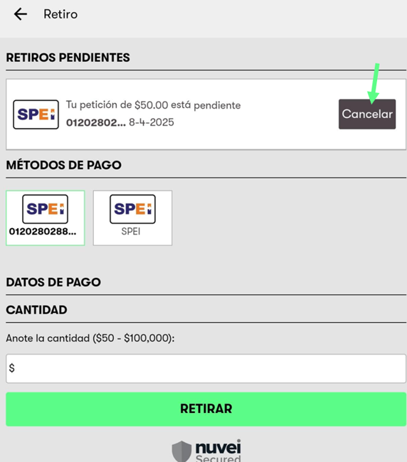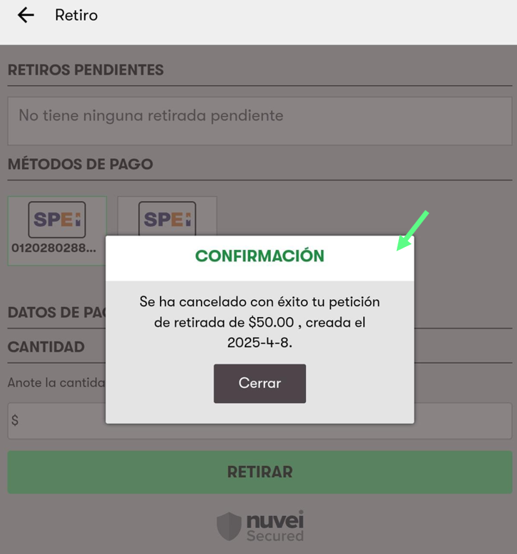 6. Una vez cancelado una ventana emergente te confirmara que tu retiro se cancelo correctamente