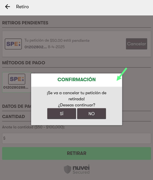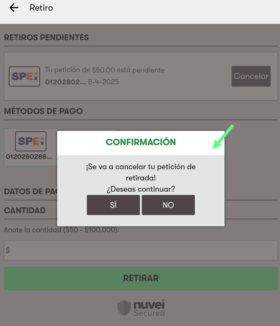 5. Luego selecciona la opción Si para cancelar el retiro
