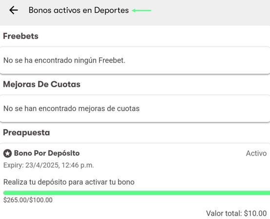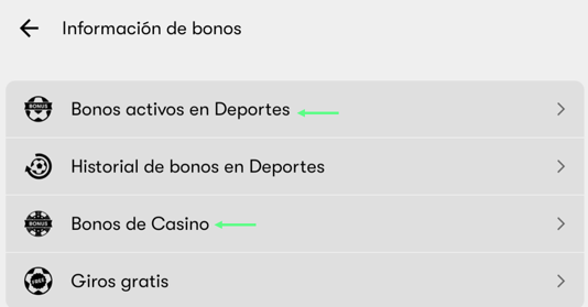 - Selecciona la opción de bonos que deseas revisar, puedes seleccionar “Bonos activos en Deportes” o “Bonos de Casino”