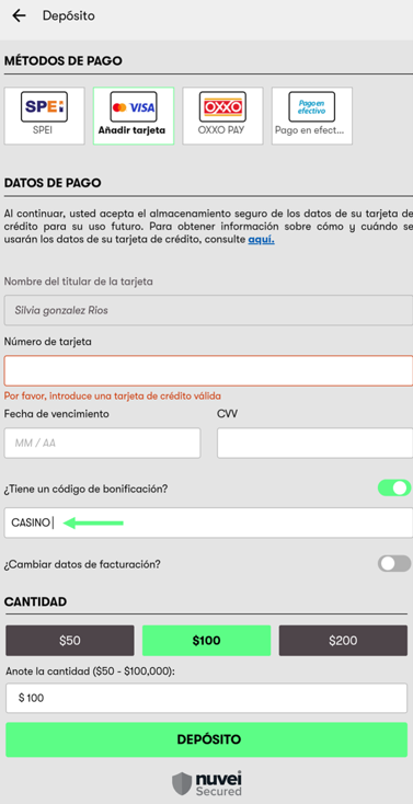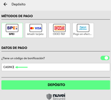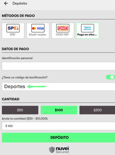 - Te enviará a la sección para realizar tu depósito. Selecciona la opción deseada para depositar e ingresa el código de promoción.