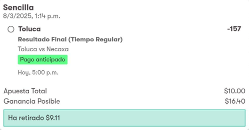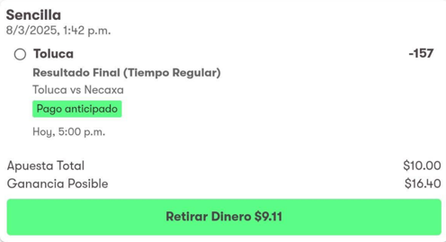 2. Elige la apuesta que tenga disponible el cash-out y deseas retirar. Seleccionar la opción “Retirar Dinero $9.11”. El monto ofertado depende de cada apuesta. Confirma la selección.