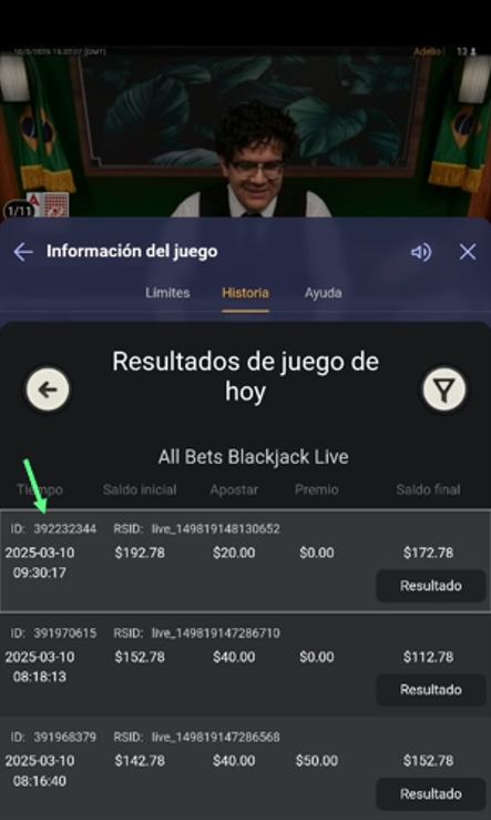 2. Debido a que el juego está en vivo la partida continuará. Al reingresar a el juego podrás ver dentro del historial tu apuesta y el resultado de esta.