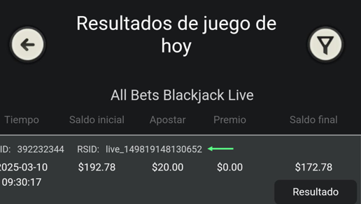 - Captura de pantalla. Selecciona la jugada desde el historial del juego. Al darle clic al botón que dice “Resultado” podrás tener toda la información de la jugada que se necesita para revisar.